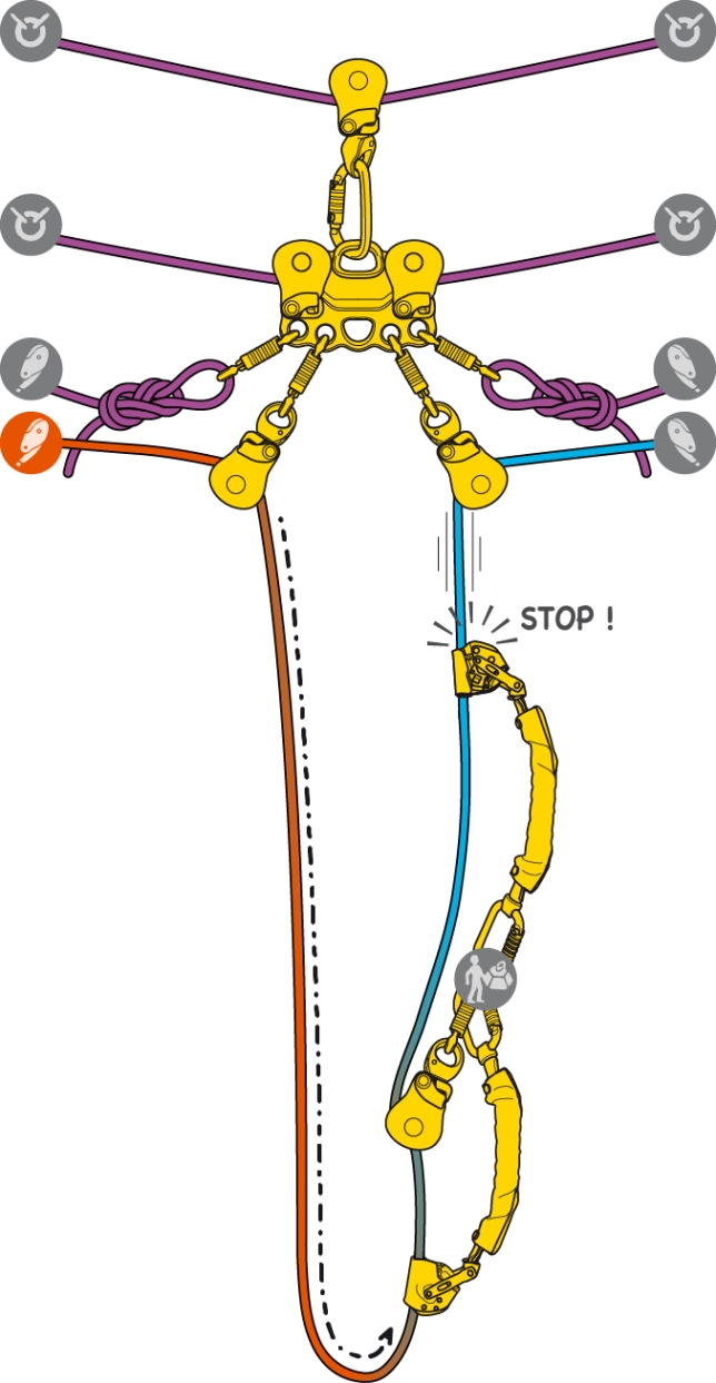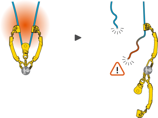 この部分でロープが破断すると、救助者とストレッチャーは、切断または擦り切れたロープの末端に非常に近い位置にある ASAP LOCK にストッパーノットなしで吊り下げられてしまいます。