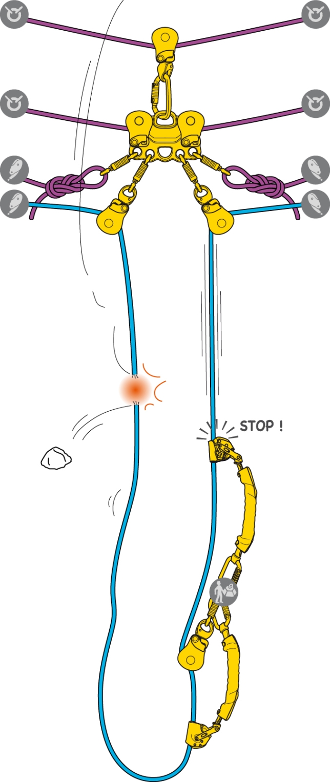 ASAP LOCK を使用して墜落を停止できることは大きな長所ですが、この種の事故を回避するために最大限の注意を払う必要があります。特に、以下に挙げる特定の区間への落石のリスクを考慮する必要があります。これは、救助者と要救助者の両方を落石の危険にさらすため、救助を行う際に異なる技術が必要となる可能性があります。
