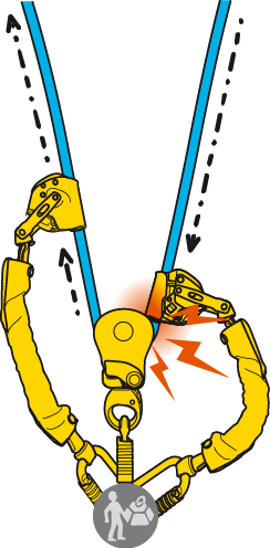 2つの ASAP LOCK のうち1つは、ロープが動いている間、それに追従してプーリーに当たって止まるまで動きます。これにより、両方の器具の摩耗を増加させる可能性があります。