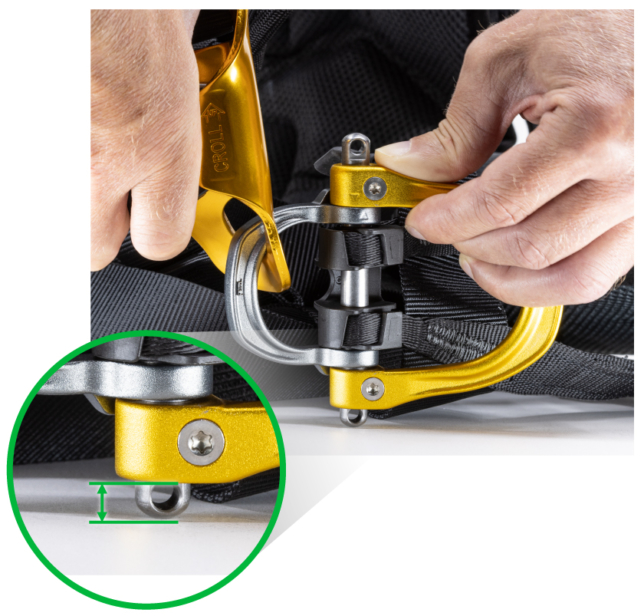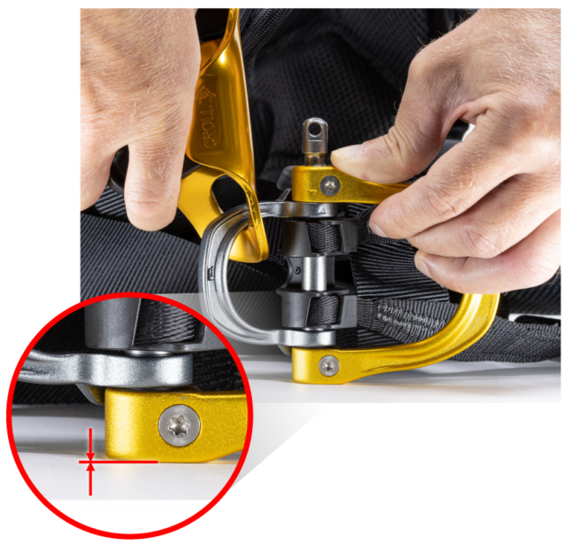2023 年以前に製造されたロープアクセス用ハーネス『アストロ』 (2023 年に点検の対象となったハーネス『アストロ』および『キャニオン ガイド』) のゲート付き腹部アタッチメントポイントのスクリューについて、ユーザーから早期摩耗の報告がありました。