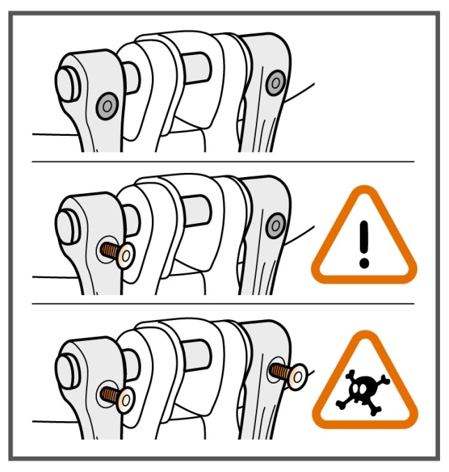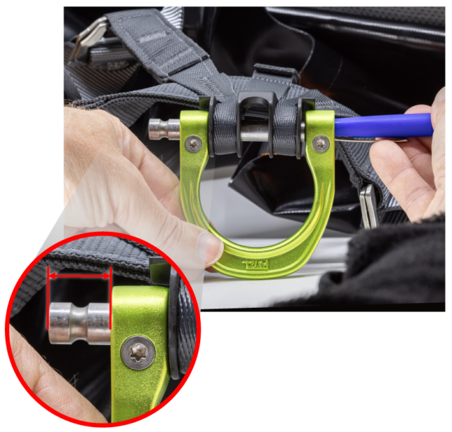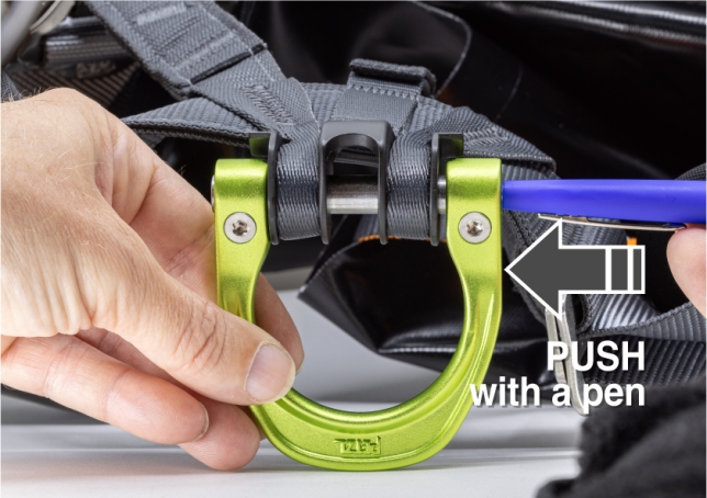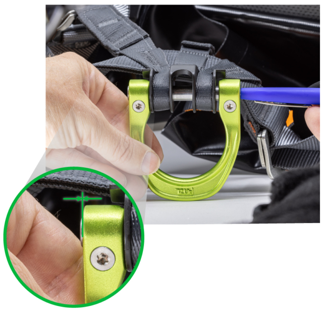 お手持ちのハーネスのゲート付き腹部アタッチメントポイントに合った交換用キット ( D 環およびスクリュー) を入手するには、お問合せフォーム より弊社へご連絡ください。キットは無料で配布され、交換に関する説明書が同封されます。