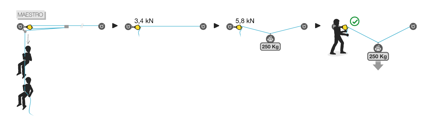 • おもりがぶら下がった際のロープの弛みを最小限にしたい場合にのみ、高い張力をかけることが必要になります。それ以外の場合は、支点への過度な荷重を防ぎ、解除をスムーズに行えるよう、張力を 2 kN 未満とすることを推奨します。この張力は、ひと1人が3: 1 のプーリーシステムで引くことで得られます