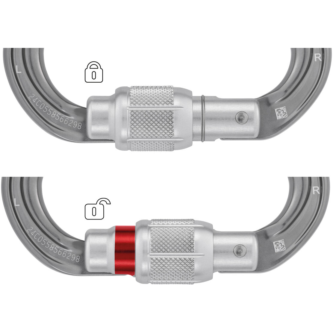 • スクリューロック: カラビナがロックされていないと赤い警告表示が見える手動ロッキングシステム